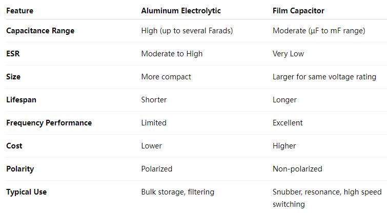 I condensatori a film hanno in genere un ESR molto inferiore rispetto agli elettrolitici in alluminio, il che li rende adatti per applicazioni ad alta frequenza o con basse perdite. Tuttavia, molti moderni condensatori elettrolitici con terminale a vite sono progettati con caratteristiche ESR migliorate per soddisfare requisiti sempre più esigenti.